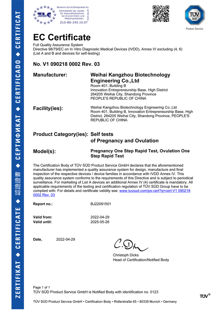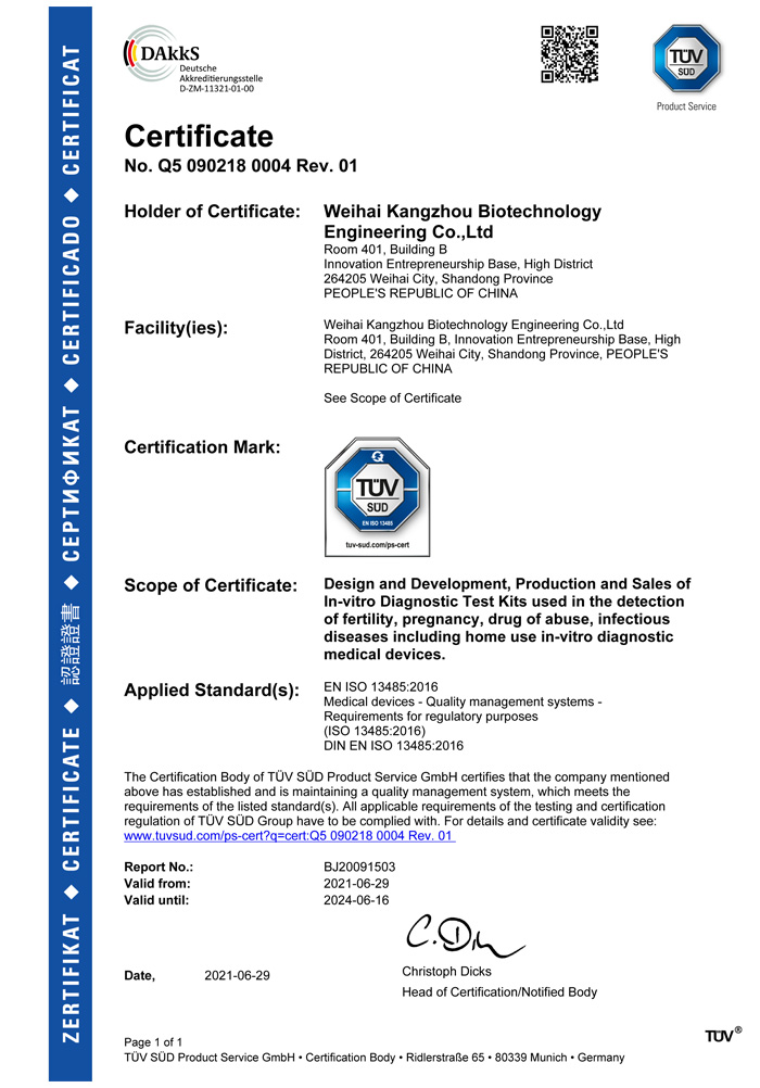 ? ? ?威海康州生物工程有限公司成立于2013年,公司坐落于風景秀麗的海濱小城——威海市。康州生物是集研發(fā)、生產和銷售于一體的生物科技公司,與威海哈爾濱工業(yè)大學合作研發(fā)團隊,擁有先進的科研基地及生產基地。主要從事快速診斷檢測產品的研發(fā)、生產、銷售。產品涵蓋:生育檢測、藥物濫用檢測、農藥殘留檢測以及其他臨床診斷檢測等。公司自主研發(fā)生產得早早孕試紙,排卵檢測試紙,毒品檢測及疾病檢測等醫(yī)用產品,經過歐盟認證,產品質量穩(wěn)定,值得信賴。